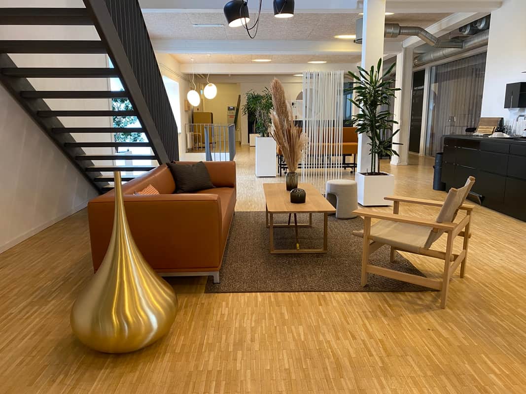 Gulvbelægningen består generelt af trægulve, mens lofterne er beklædt med træbetonplader og ventilationsrør, hvilket bidrager til et moderne og industrielt udtryk samt et godt indeklima i ejendommen. Ejendommen er præmieret af Brøndby Kommune for dens flotte og tidssvarende istandsættelse.